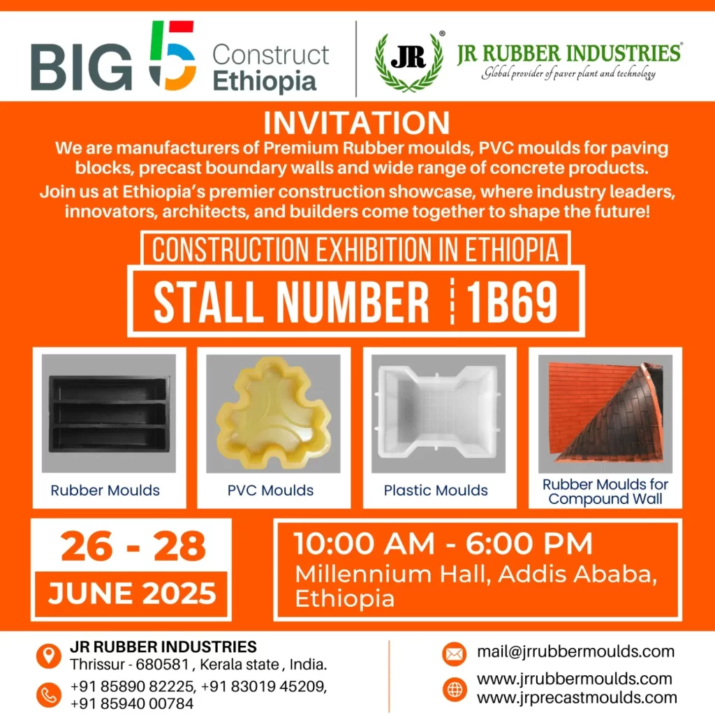 The Big 5 Construct Ethiopia 2025 took place from 23rd – 25th May 2025 at the Millennium Hall, Addis Ababa, Ethiopia. This premier event gathered innovators, contractors, and industry leaders to accelerate Africa’s construction growth. JR Rubber Industries proudly showcased our wide range of rubber moulds, PVC moulds, plastic moulds, and machinery solutions for precast manufacturing.